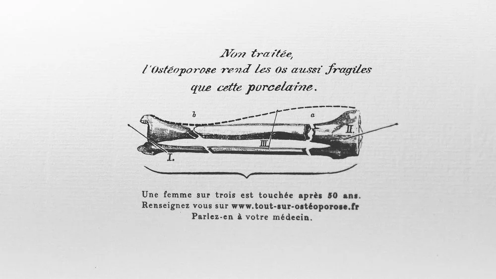 A collection of four porcelain plates was created with a porosity 40% higher than normal, making it as fragile as a bone affected by osteoporosis. These plates break upon the slightest contact. They were sent to the press and influencers with the following message: “Untreated, Osteoporosis makes bones as fragile as this porcelain”.